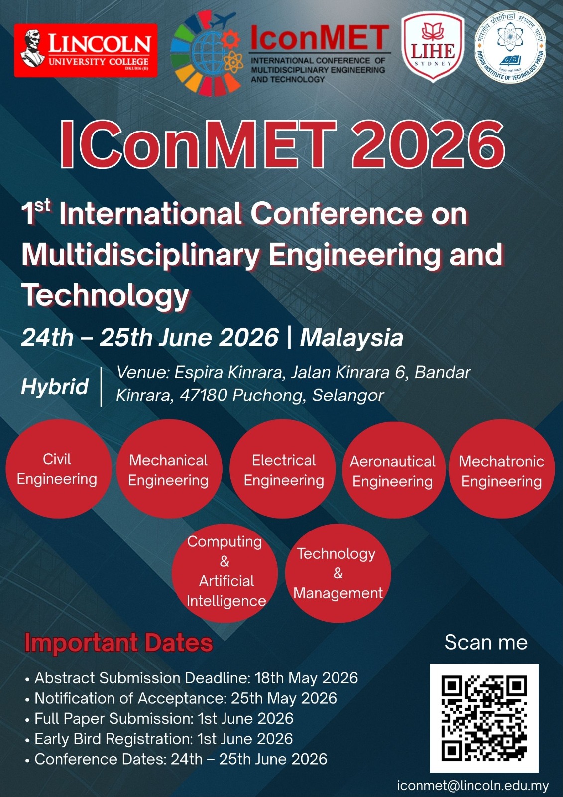The International Conference on Multidisciplinary Engineering and Technology (IConMET 2026) is the first conference organized by Faculty of Engineering and Built Environment, Lincoln University College (LUC), Malaysia. It serves as a platform for researcher, academicians, industry experts, and students from around the world to exchange knowledge, share innovations, and explore emerging trends in engineering and technology.